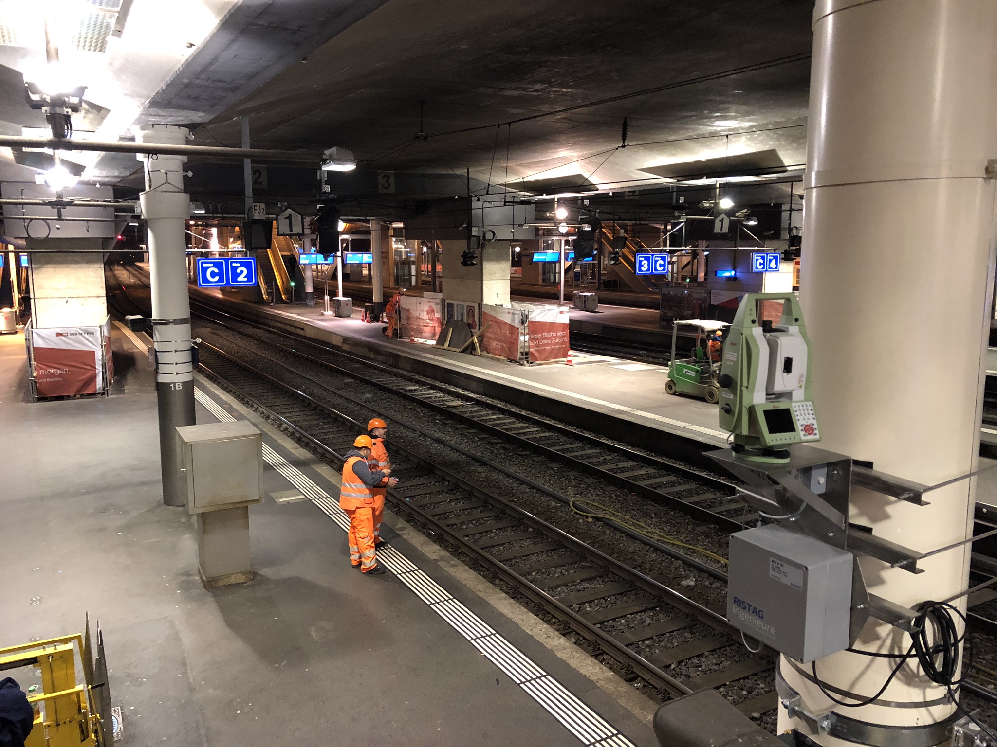 - Überwachung der Bahnhofshalle SBB (Postlifte, Stützen, Perronwände, Gleisanlagen nach dem Regelwerk I-50009, Perrons, Brückenwiderlager und Schanzenbrücke), 11 Tachymeter à ca. 750 Überwachungspunkte.