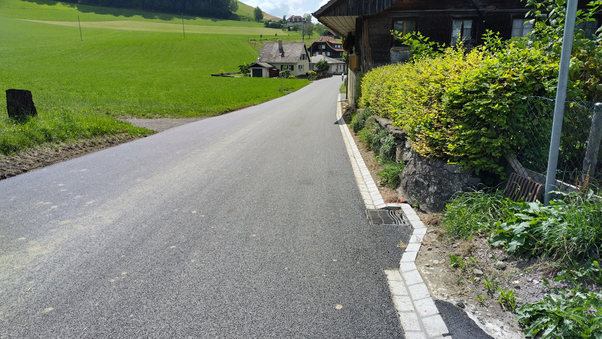 Im Anschluss an diverse Werkleitungsprojekte wurde zum Abschluss die Binder- und Deckschicht auf einer Strecke von ca. 1.0 km erneuert. Innerorts wurde ein lärmmindernder Belag verbaut, während ausserorts ein Standardbelag mittels Hocheinbau eingebaut wurde. Dabei wurden Randabschlüsse ergänzt, die Strassenentwässerung lokal angepasst und Hindernisse für den künftigen Unterhalt behoben.