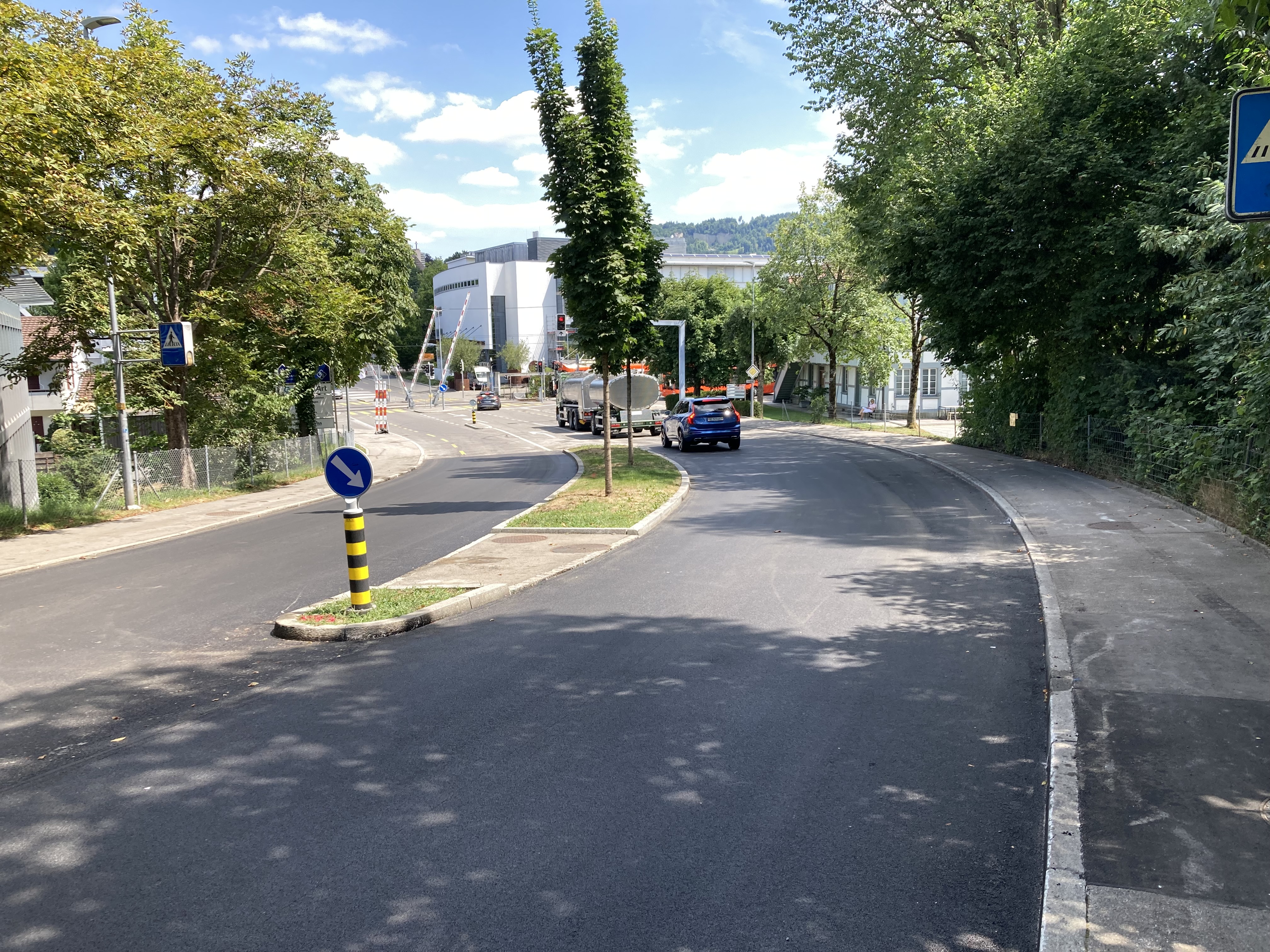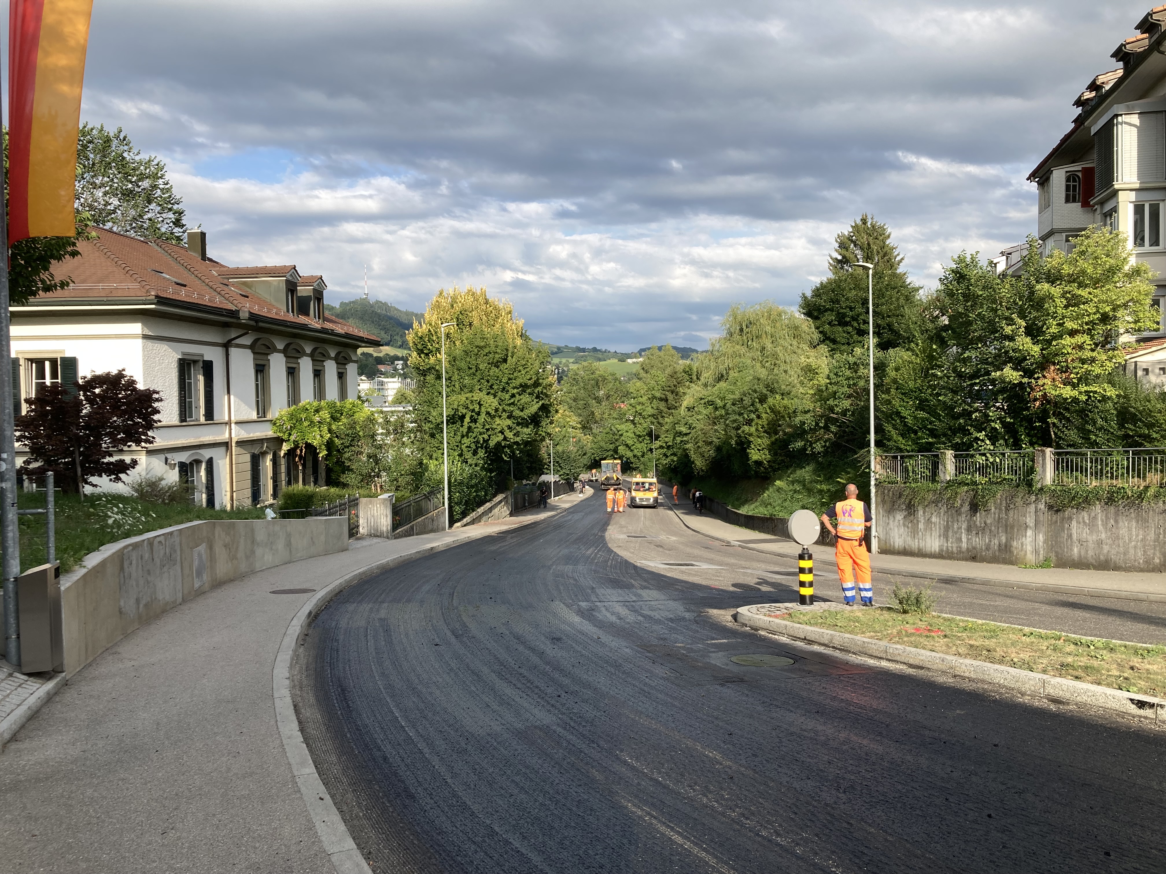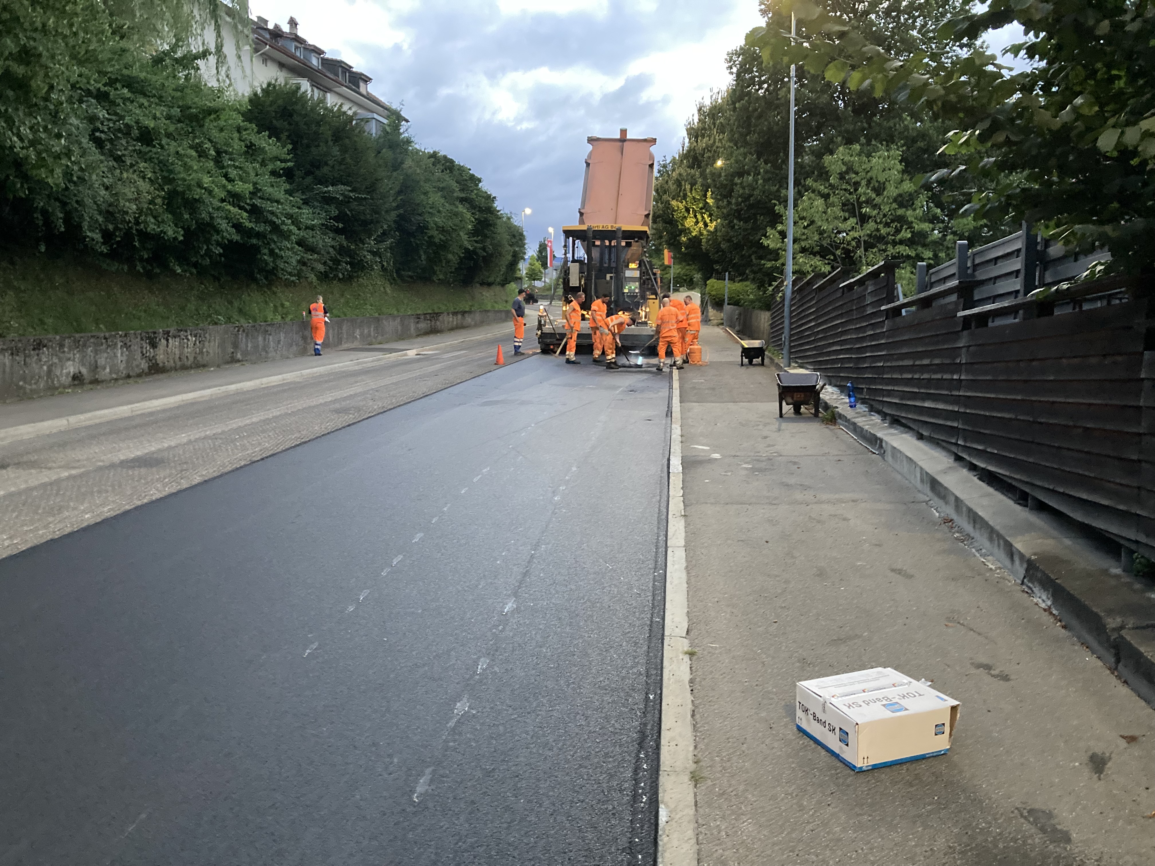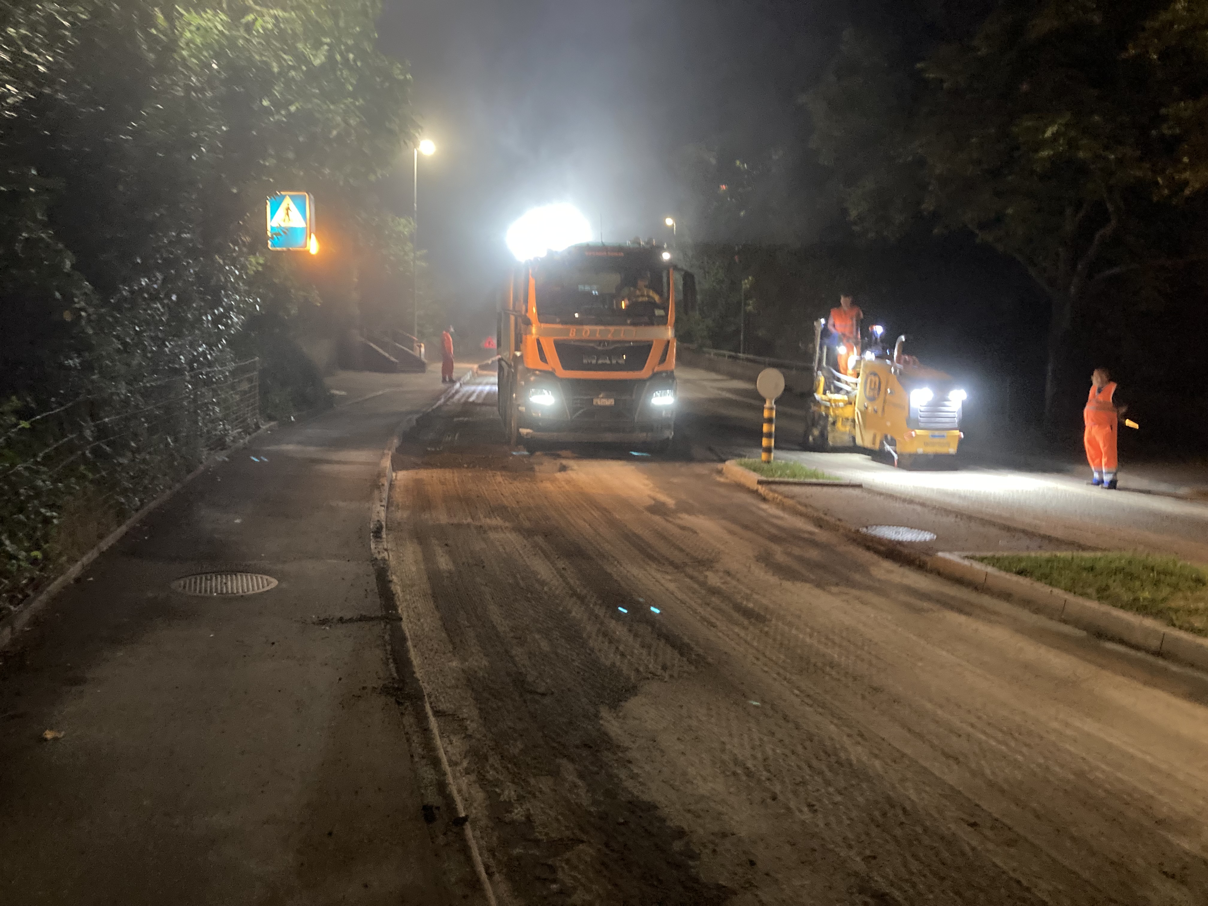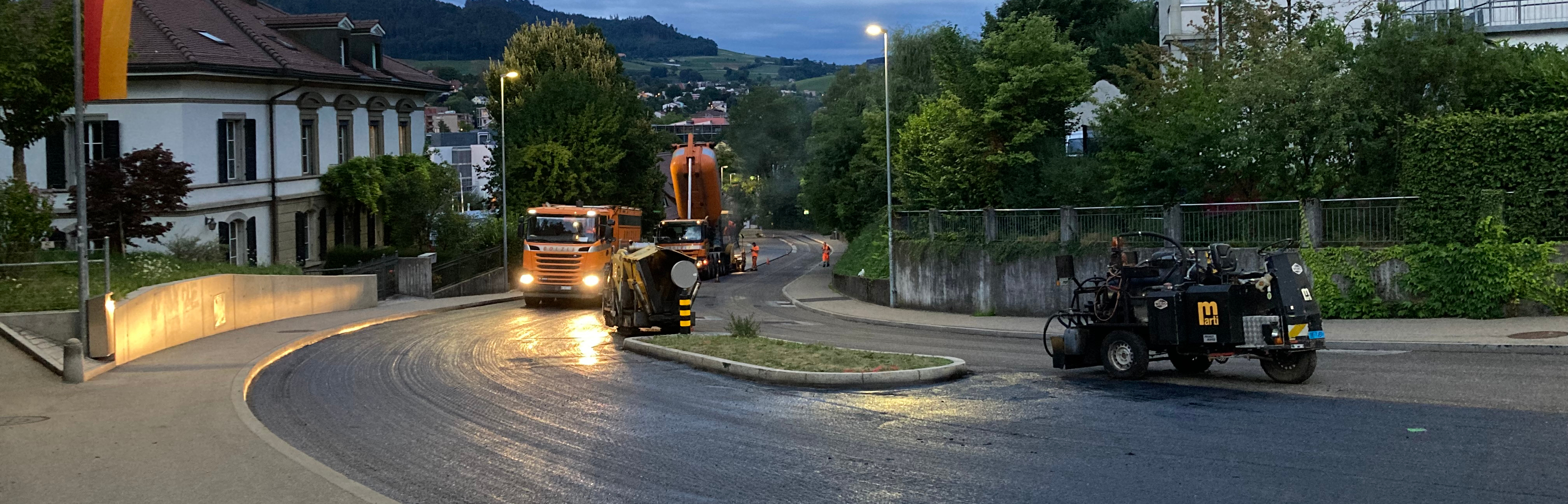 Die stark befahrene Papiermühlestrasse in Ittigen musste saniert werden. Aufgrund des hohen Verkehrsaufkommens, des nahe gelegenen RBS Bahnhofs und der angrenzenden Betriebe musste der Bauablauf optimal koordiniert werden. In mehreren Nachteinsätzen wurden Vorarbeiten geleistet und anschliessend der Deckbelag eingebaut. Ein lärmmindernder SDA-Belag in Kombination mit beigemischter Belagsarmierung soll den künftigen Verkehrslasten standhalten und die angrenzenden Anwohner vom Lärm entlasten.
