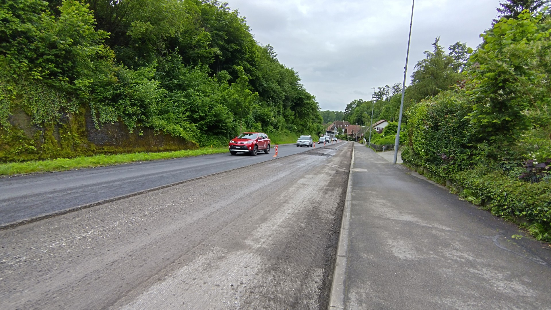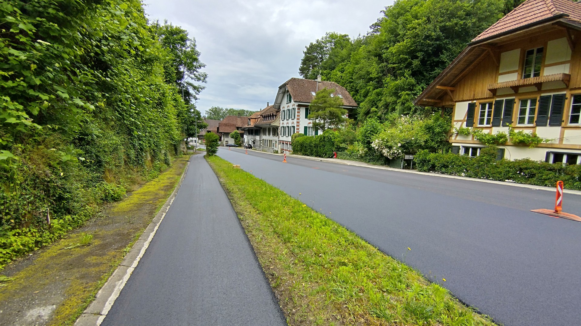 Im Anschluss an diverse Werkleitungsprojekte wurde zum Abschluss die Binder- und Deckschicht auf einer Strecke von ca. 1.0 km erneuert. Innerorts wurde ein lärmmindernder Belag verbaut, während ausserorts ein Standardbelag mittels Hocheinbau eingebaut wurde. Dabei wurden Randabschlüsse ergänzt, die Strassenentwässerung lokal angepasst und Hindernisse für den künftigen Unterhalt behoben.